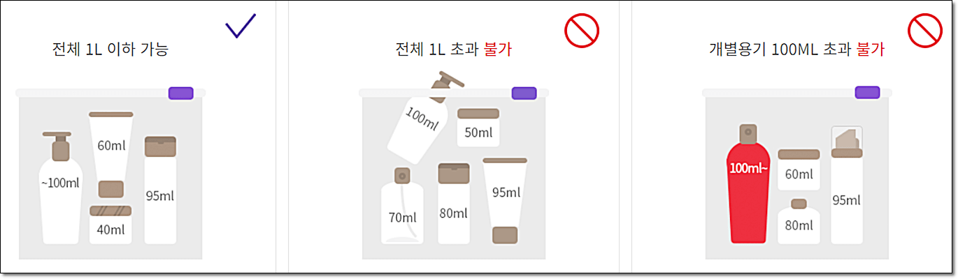 ● 각 용기의 용량이 100ml 이하로 1인당 1개의 1L 용량의 투명 비닐 지퍼백에 넣어 휴대반입가능