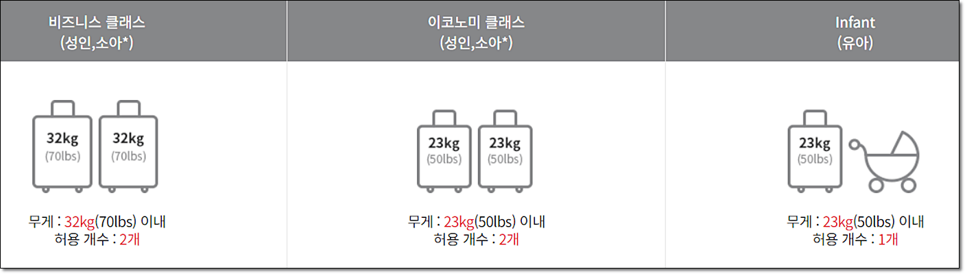 | 무게초과요금 | 24kg ~ 32kg | KRW 100,000 USD 100 CAD 100 (단, 브라질 출도착은 무료) |