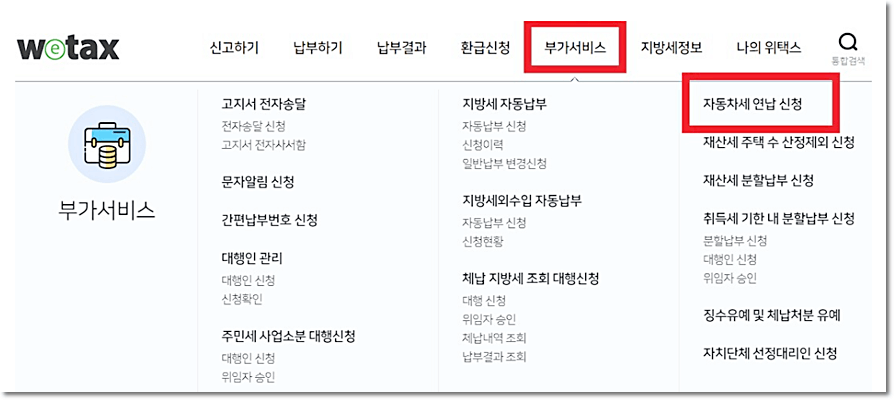 - 홈페이지 메인 부가서비스 → 자동차세 연납 신청